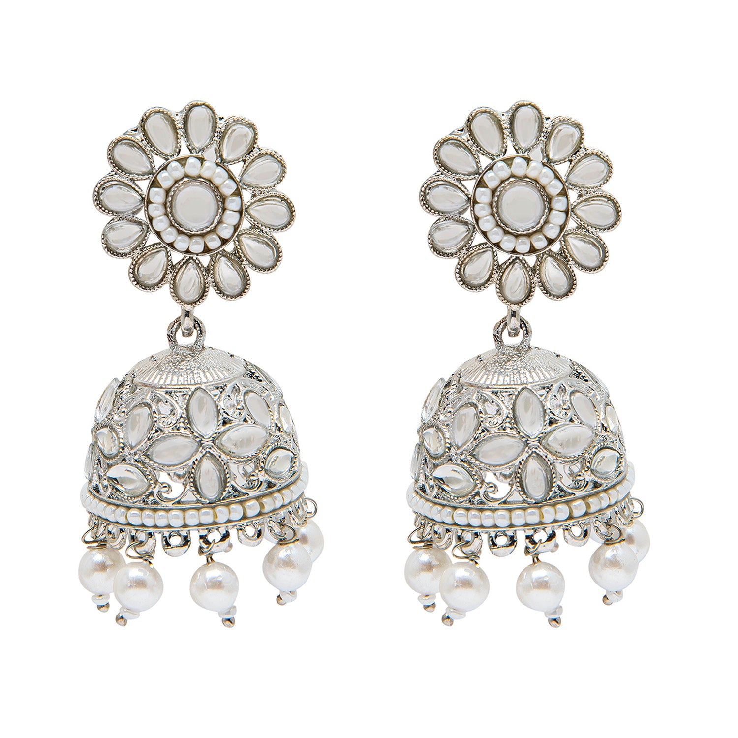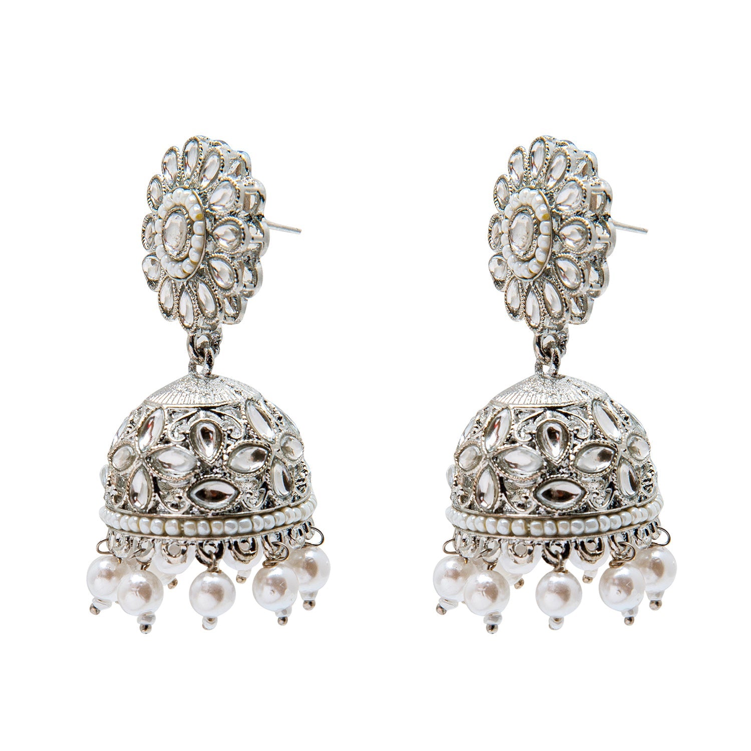 - BEAUTY - A stylish party wear Designer Indian Silver Oxidized Pearl Hanings Hoop Jhumka Earrings for women from the house of Crunchy Fashion is perfect for this wedding and festive season. Creatively embellished with Kundan & AD crystals, this designer set will add a tinge of charm to your attire.