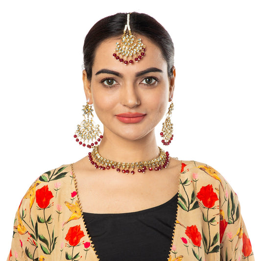 Gold Plated Kundan Maroon Pearl Bridal Necklace Combo Nec...