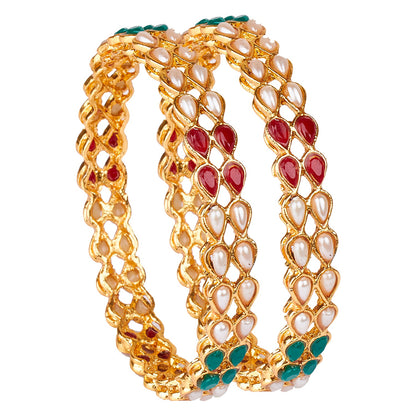 22K Traditional Gold Kada Bangle Set with Pearls and Kundan for Women (Set of 2 Bangles) (SJ_3254)