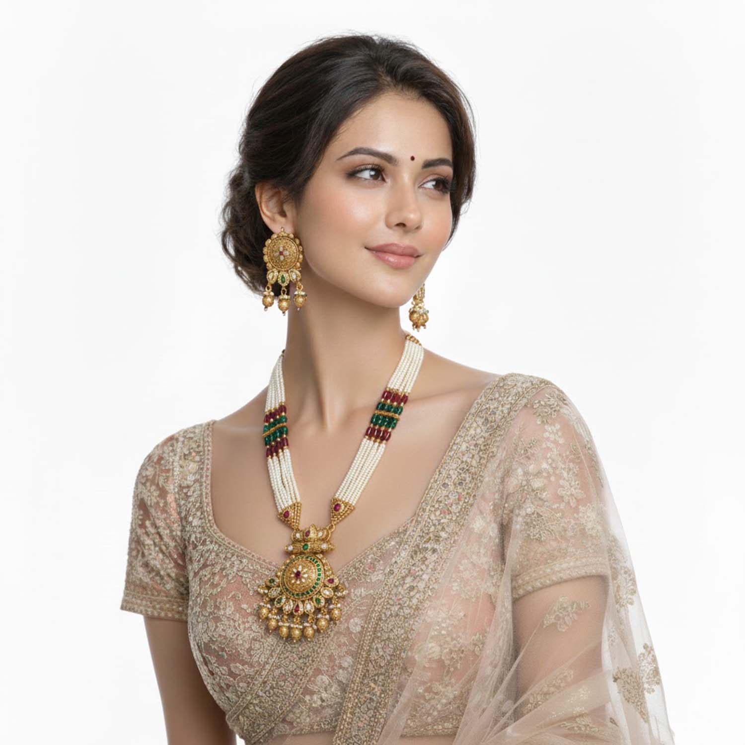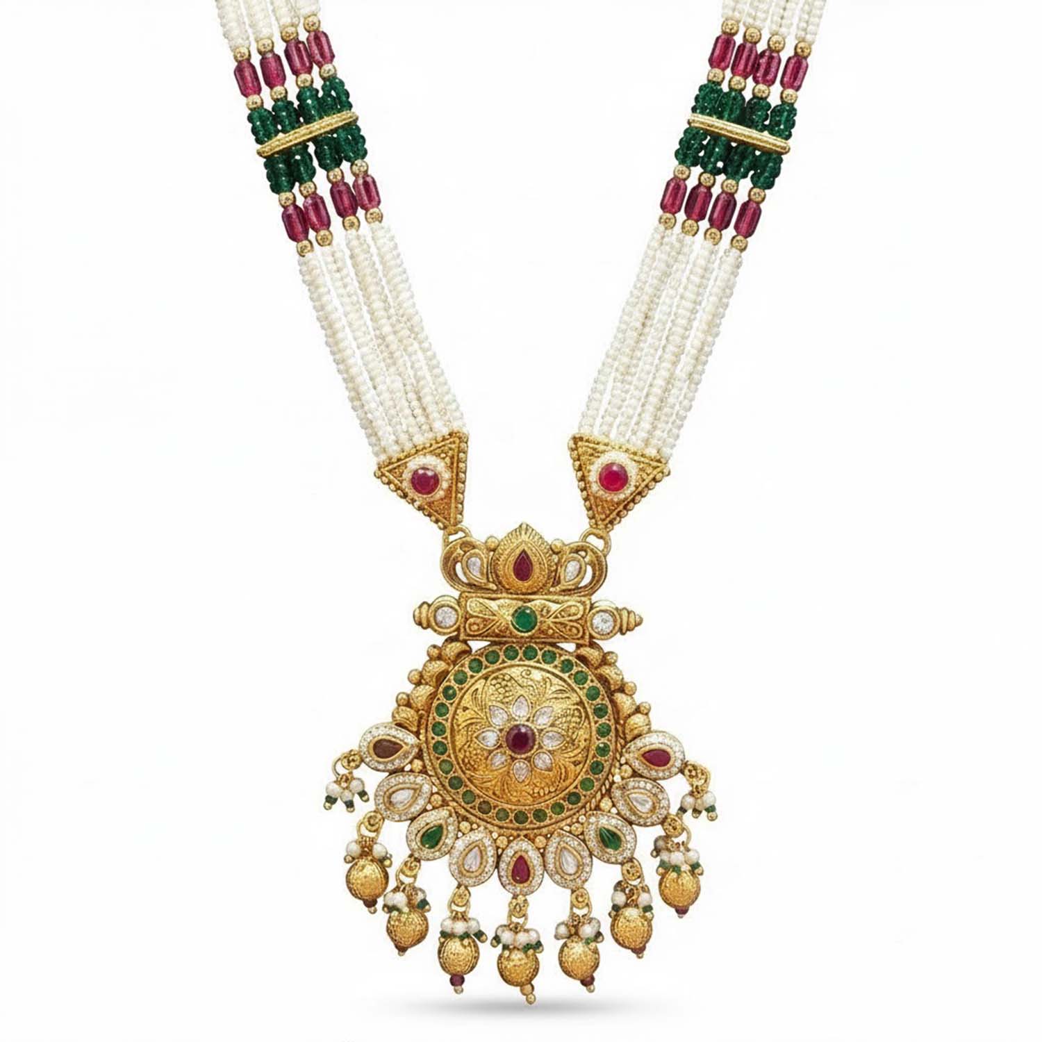 The centerpiece pendant showcases intricate Kundan work with floral motifs and hanging beads