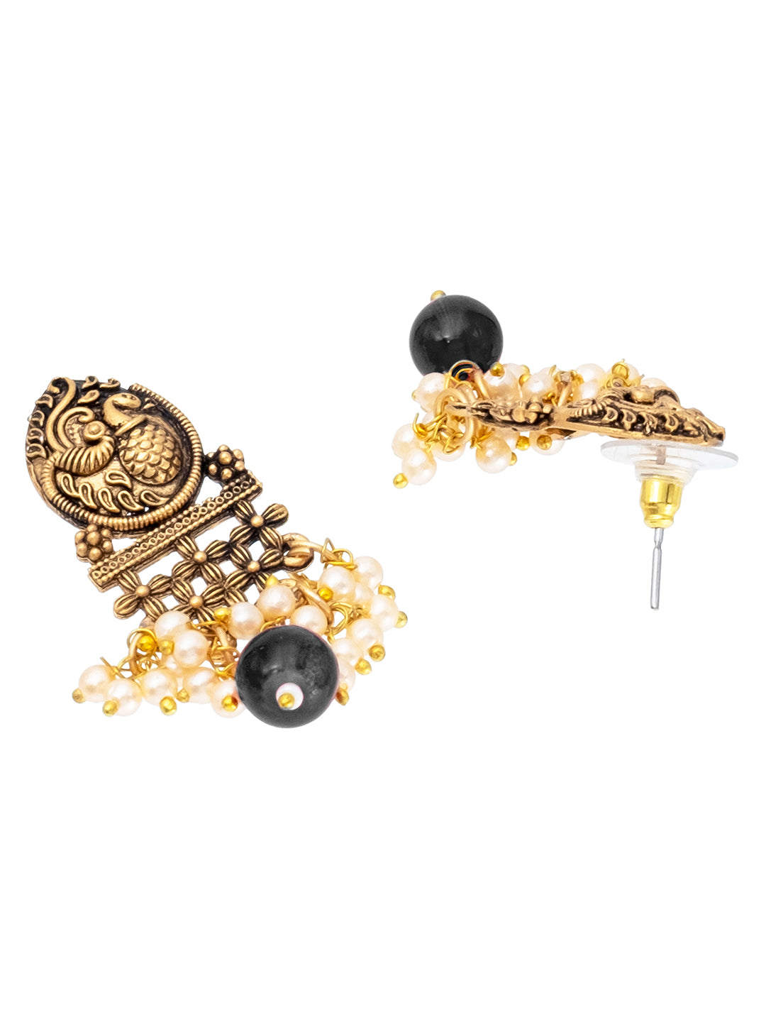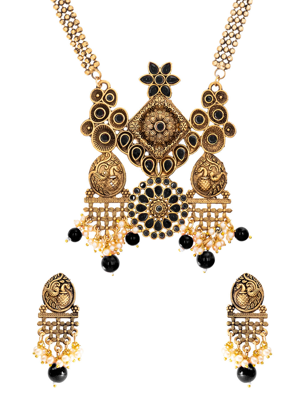 Traditional Indian Matte Antique Gold Plated Oxidised Kundan,CZ, Studded Peacock Design Dori Necklace with Matching Earring Jewelry Set For Women - Black (SJN_259_BK)