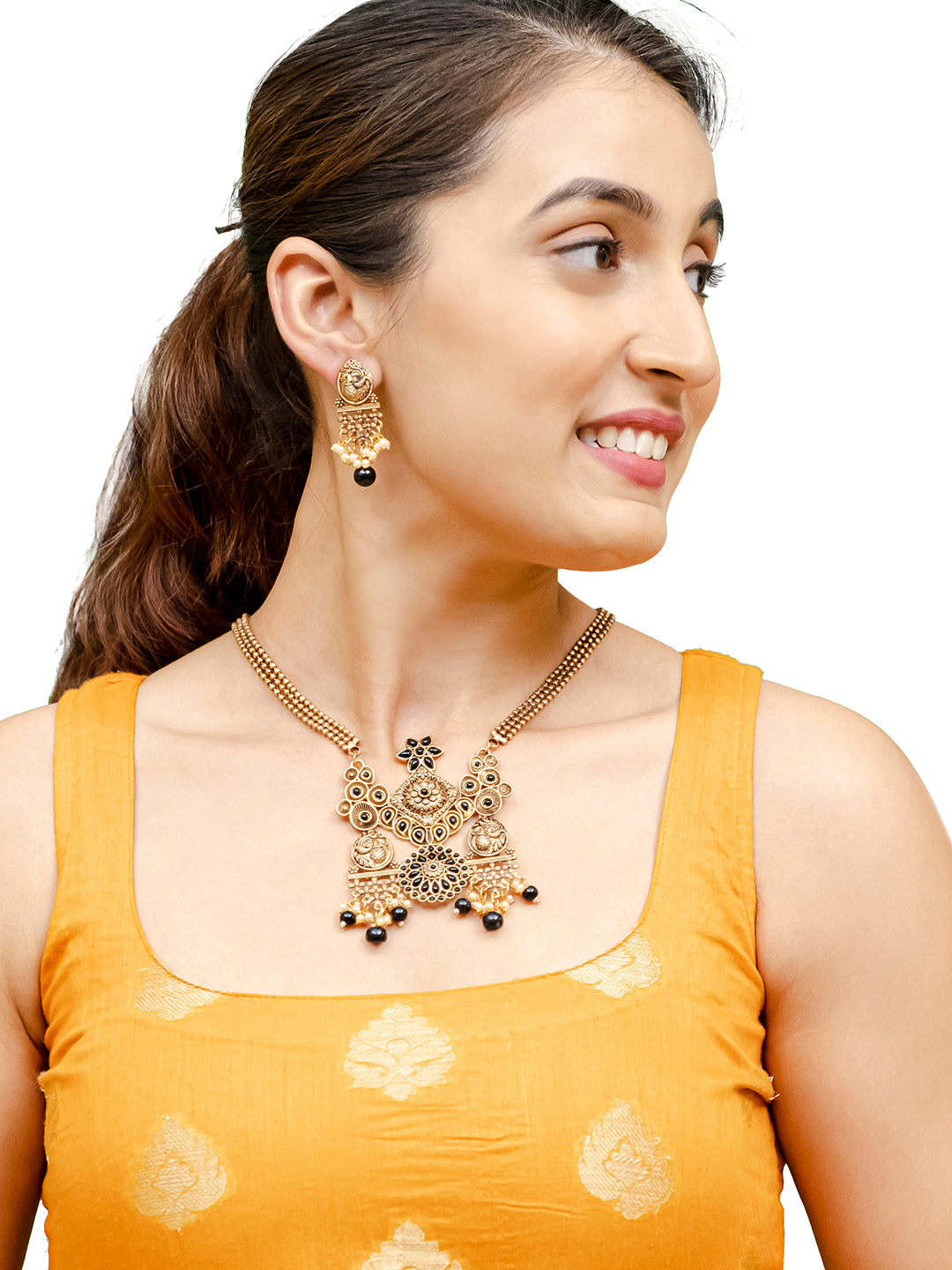 - Color - Gold Black || Necklace Length - 18''|| Jhumka Earrings Length - 5 Cm || Pendant Length - 3''