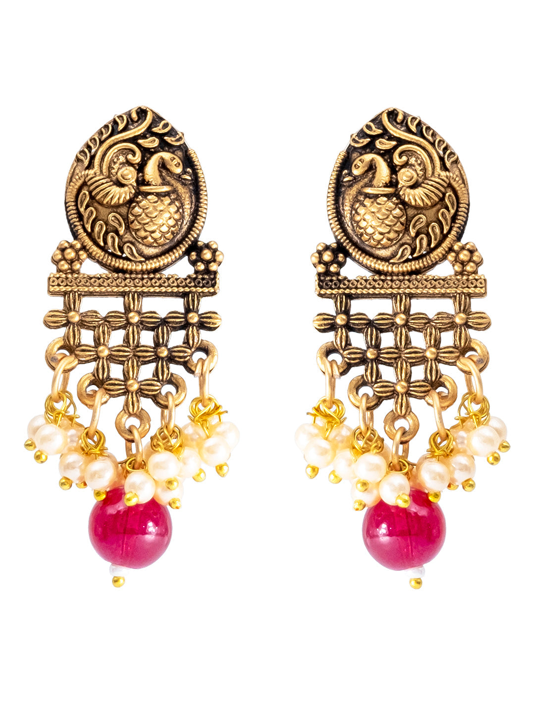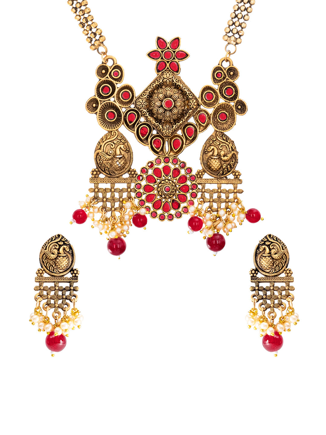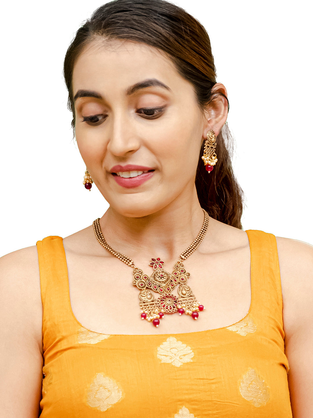 - Matte Antique Gold Plated Peacock Design Pendant with matching Earring Adjustable Dori Necklace Set For Women jewellery is among the most artful of all jewellery types and plays an essential role in the cultural heritage of India.