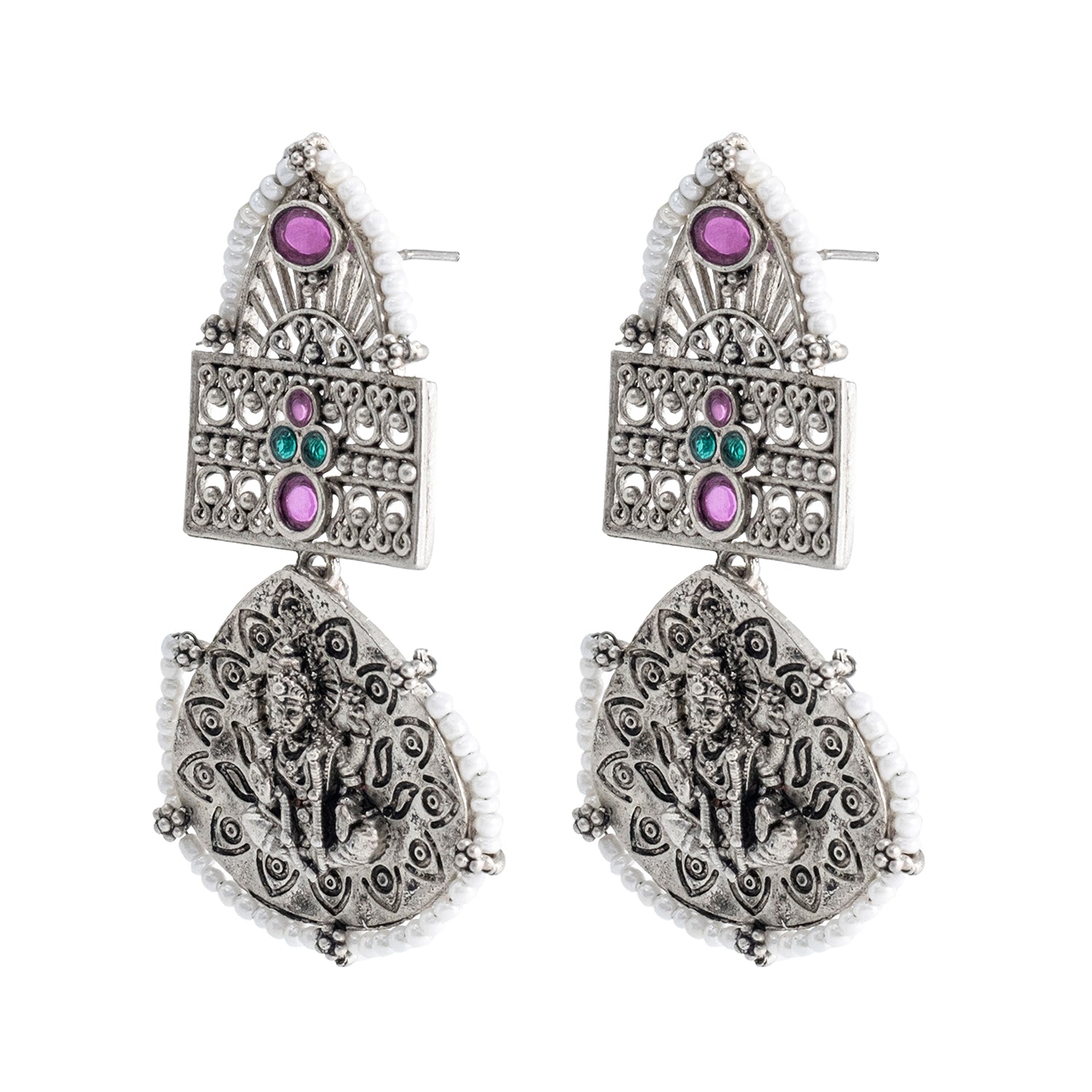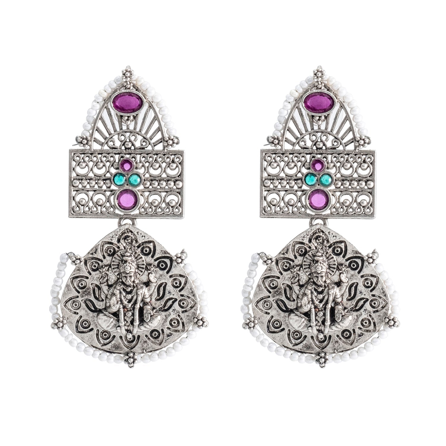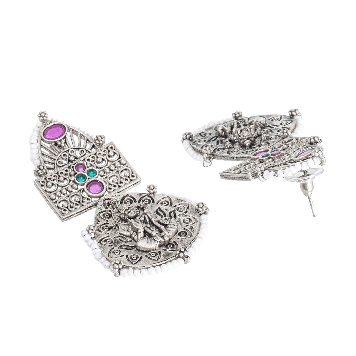 Traditional Indian Matte Silver Oxidised CZ, Crystal Studded Leaf Laxmi Temple Earring For Women- Silver Ruby Green (SJE_209_S_R_G)