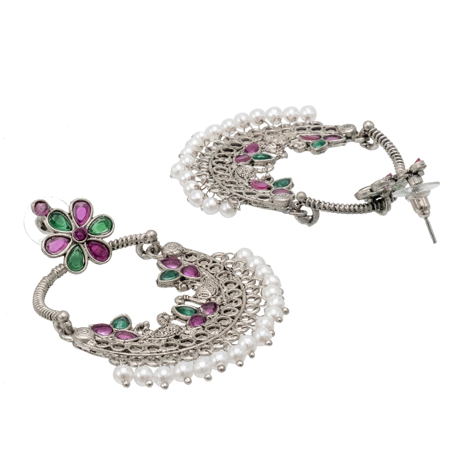 Traditional Indian Matte Silver Oxidised CZ Crystal Studded Peacock Chand Bali Earring For Women-Silver Ruby Green (SJE_192_S_R_G)