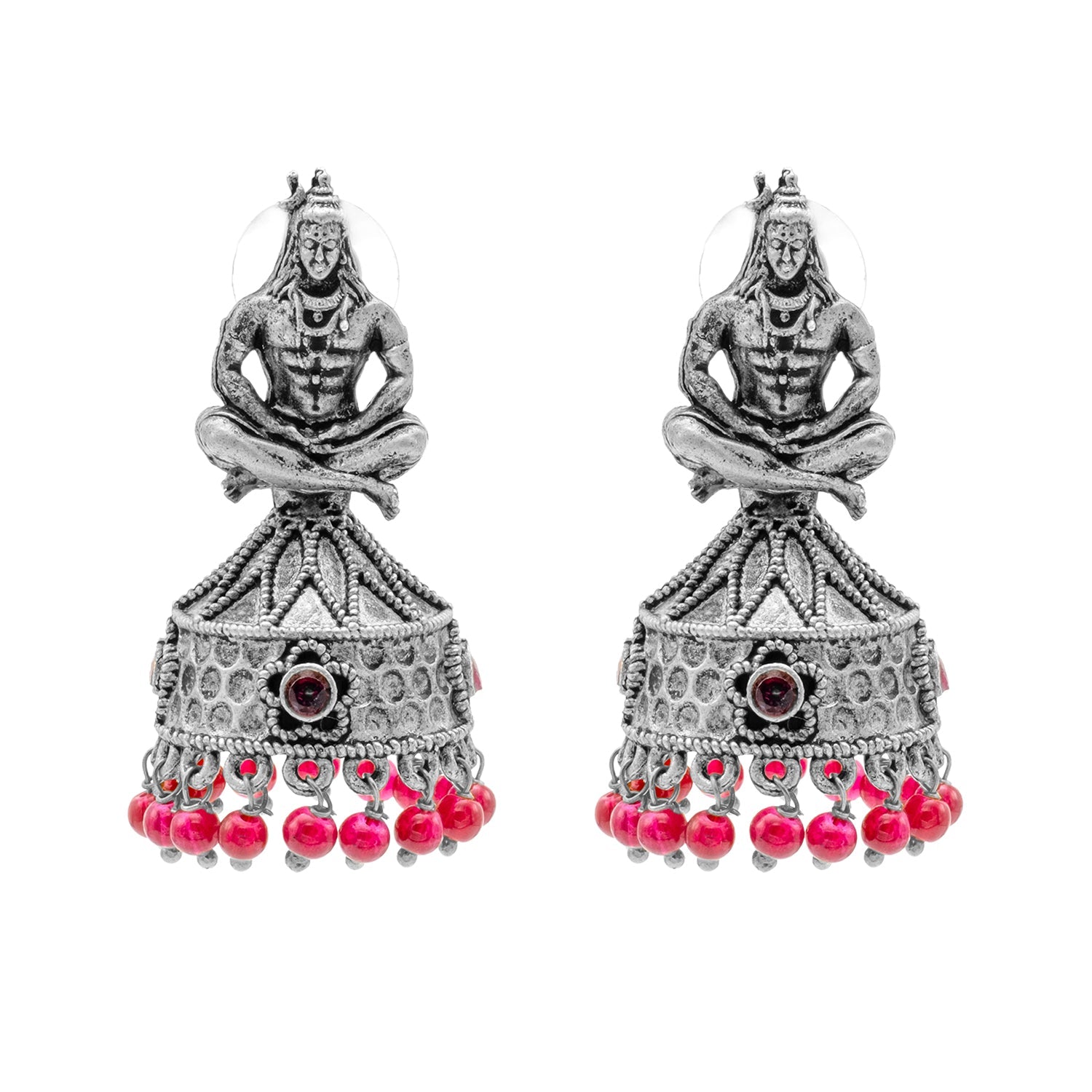 Traditional Indian Matte Silver Oxidised CZ, Crystal Studded Temple Jhumka Earring For Women-Silver, Maroon (SJE_219_S_M)