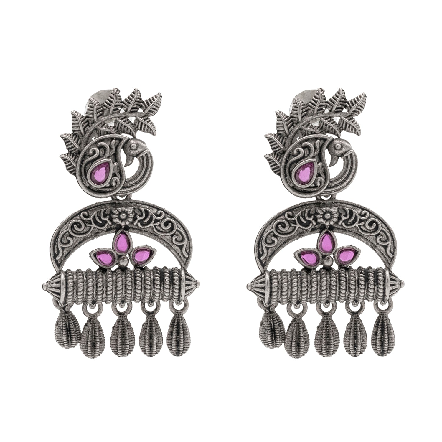 - Matte Silver Oxidized Medium sized Studded Drop Peacock Design Earring for women