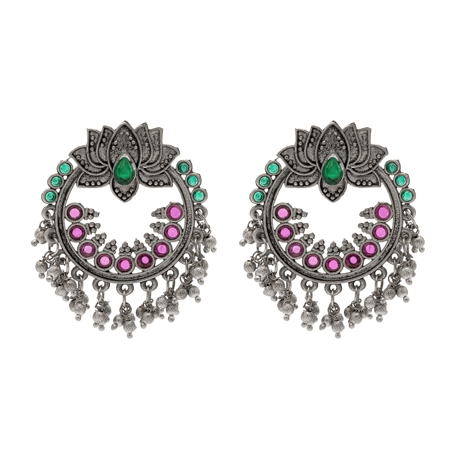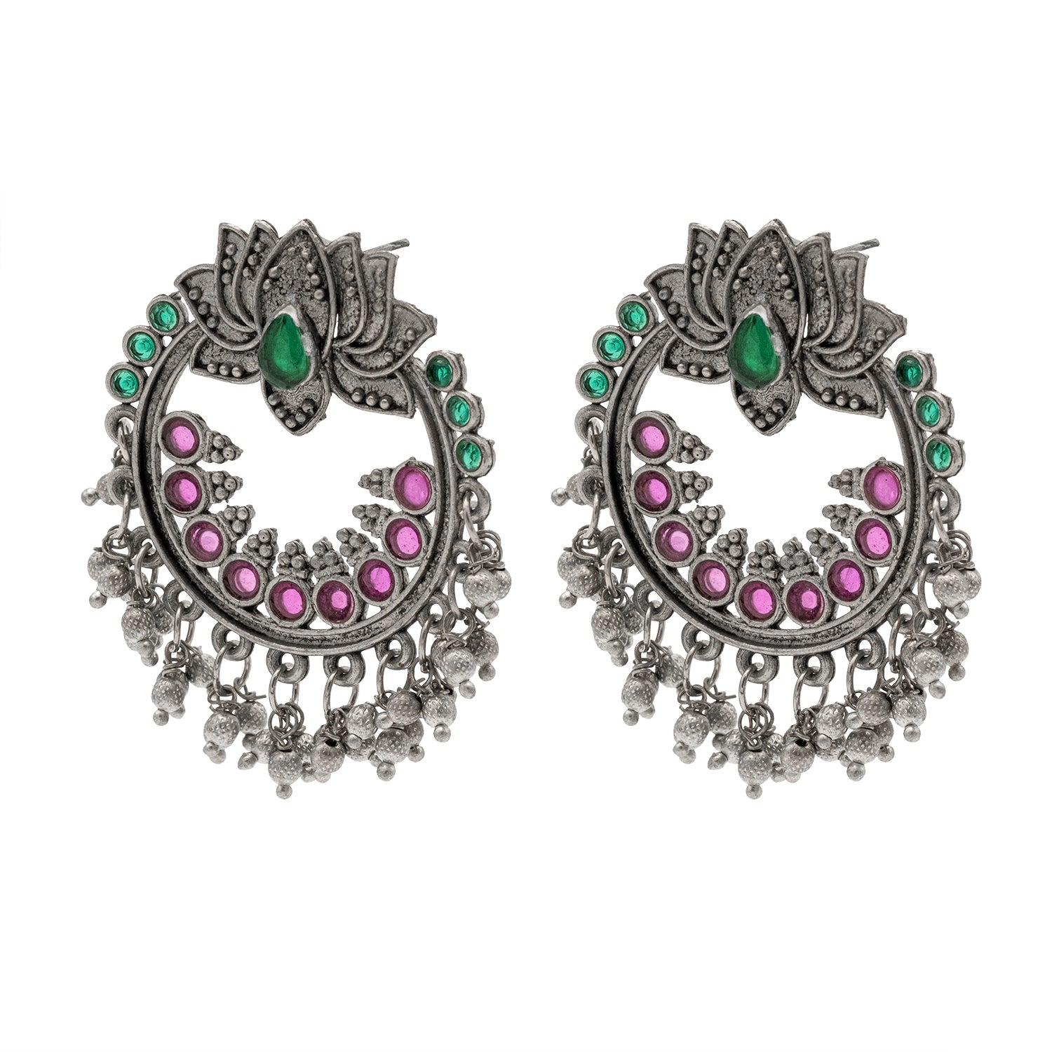 - Matte Silver Oxidized Medium sized Studded Lotus - Kamal Chand Bali Earring for women