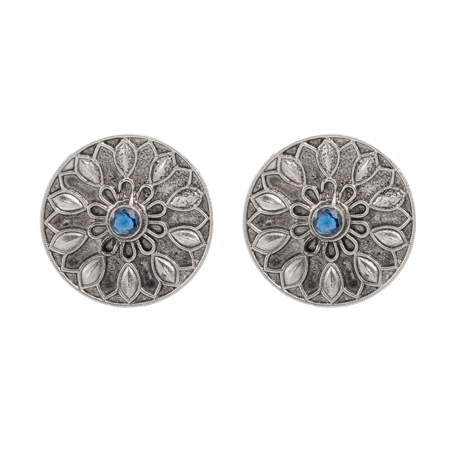 Traditional Indian Matte Silver Oxitised CZ Crystal Studded Motif Stud Earring For Women - Silver Blue (SJE_139_S_BL)