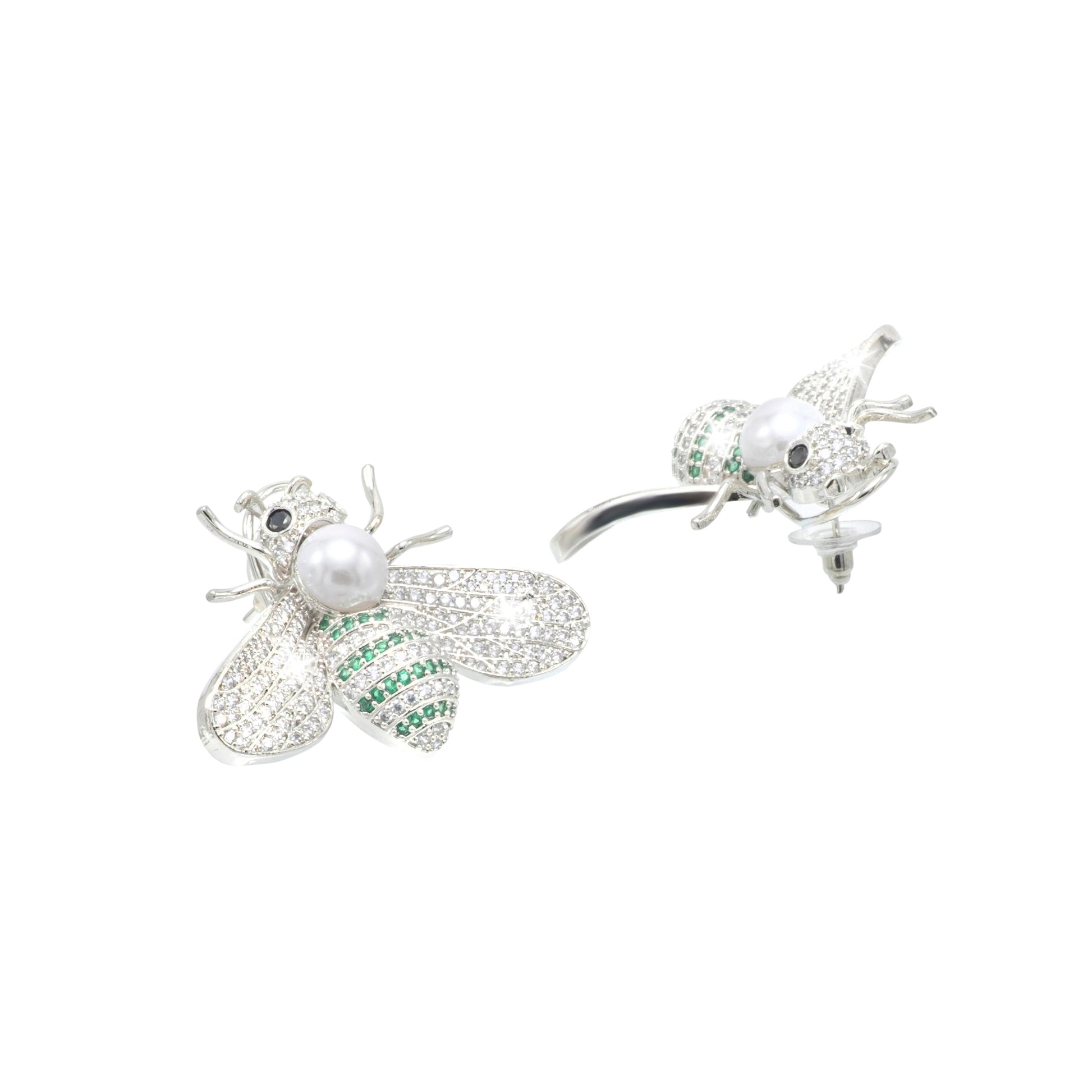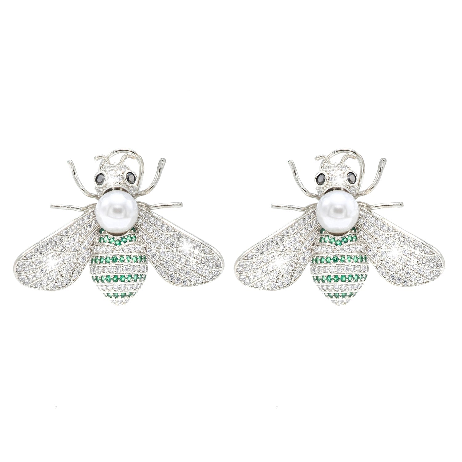 Western Design, CZ, Zirconia, Crystals, Pearls Rhodium Silver Plated Large Size Honey Bee Mosquito Bug Earrings for Women - (SJE_307_S_G)